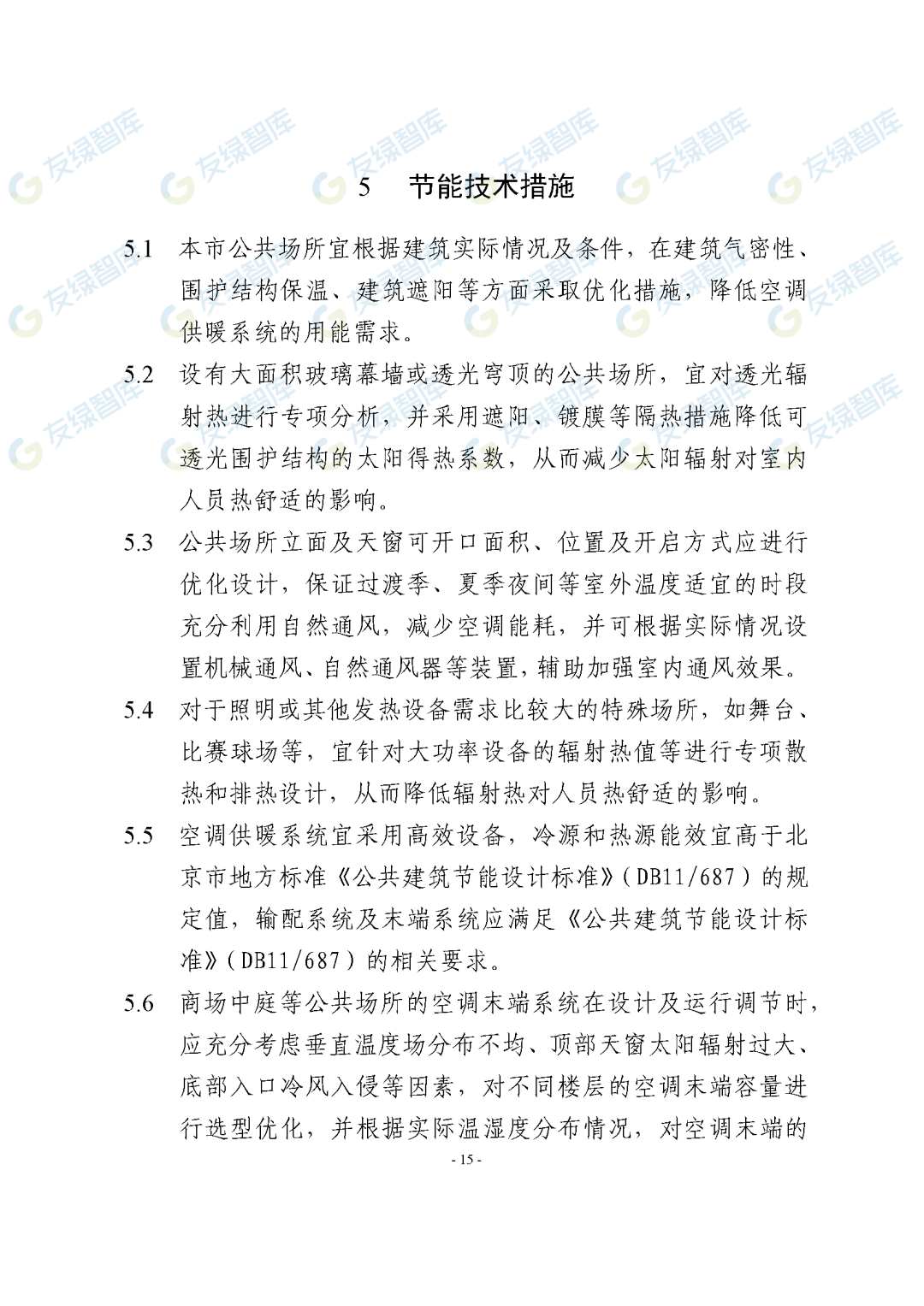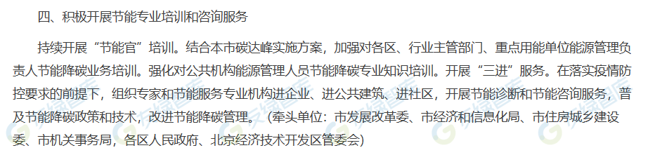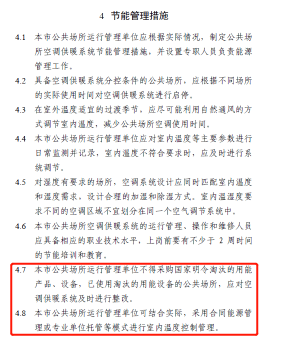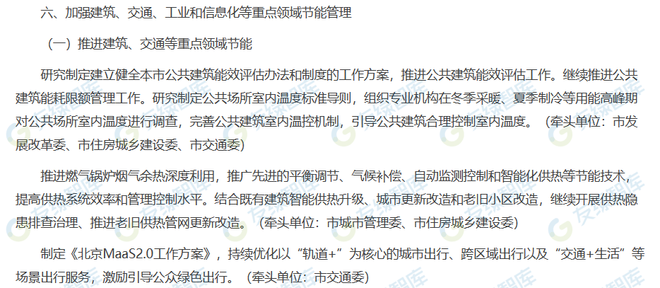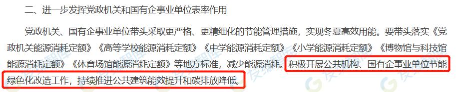 在具体实施中,要求“积极开展公共机构、国有企事业单位节能绿色化改造工作,持续推进公共建筑能效提升和碳排放降低。”,而改造就意味着更多的市场机会。 从第四点来看,无论节能降碳专业培训还是咨询服务,都将迎来春天。当然也将会有更激烈的竞争,汰劣留良,促使行业更加规范。 公共建筑能耗限额管理正在成为制度性、长期性工作,也就意味着建筑节能服务行业能够有持续的收入来源。 如果说《北京市进一步强化节能实施方案(2023年版)》是指导性意见,那么《北京市 公共场所室内温度控制导则(试行)》的要求更加明确。 《北京市 公共场所室内温度控制导则(试行)》 小编认为,《北京市 公共场所室内温度控制导则(试行)》推出之后,将有一批用能设备面临更换,这是节能设备厂商的机会。 在双碳目标确立两年之后,1+N政策体系基本搭建完毕,我国即将迎来具体落地实施政策(双碳目标分解,并层层具体分配落实到行业、企业乃至个人)。留给各行各业的过渡和转型的已经基本过去,接下来,是拼真本事的时候了。 政策原文: 北京市发展和改革委员会等11部门关于印发北京市进一步强化节能实施方案(2023年版)的通知 京发改〔2022〕1672号 各有关单位: 节能是生态文明建设的内在要求,是绿色北京建设的重要任务。为充分发挥节能的“第一能源”作用,进一步保障本市能源安全平稳高效运行,协同推进降碳、减污、扩绿、增长,我们结合新形势新要求,对《北京市发展和改革委员会等11部门关于印发北京市进一步强化节能实施方案的通知》(京发改〔2021〕1549号)进行了修订,形成了《北京市进一步强化节能实施方案(2023年版)》,已经市政府同意,现予以印发,请贯彻落实。 特此通知。 北京市发展和改革委员会 北京市机关事务管理局 北京市住房和城乡建设委员会 北京市经济和信息化局 北京市城市管理委员会 中共北京市委宣传部 北京市商务局 北京市交通委员会 北京市教育委员会 北京市市场监督管理局 北京市人民政府国有资产监督管理委员会 2022年12月6日 北京市进一步强化节能实施方案 (2023年版) 节能是生态文明建设的内在要求,是绿色北京建设的重要任务,是协同推进降碳、减污、扩绿、增长的重要源头措施。为立足新发展阶段,完整、准确、全面贯彻新发展理念,主动服务和融入新发展格局,积极稳妥推进碳达峰碳中和,充分发挥节能的“第一能源”作用,进一步保障本市能源安全平稳高效运行,在2021年发布的《北京市进一步强化节能实施方案》基础上,结合当前节能工作实际,修订形成本方案。 一、目标要求 全面贯彻落实党的二十大精神,把节能作为实施全面节约战略、积极稳妥推进碳达峰碳中和的重要举措,重点结合本市冬夏能源运行特点,发挥党政机关和国有企事业单位表率作用,大力倡导全民行动,以科技和专业服务为依托,以法律法规标准为保障,强化建筑、交通等重点领域节能,加强石化、水泥、数据中心等高耗能行业节能管理,压实属地、行业管理部门、用能单位三方责任,突出效率优先,坚持循序渐进,加强统筹协调,保障合理有序用能,促进本市单位地区生产总值能耗持续下降,保持全国省级地区最优水平。 二、进一步发挥党政机关和国有企事业单位表率作用 党政机关、国有企事业单位带头采取更严格、更精细化的节能管理措施,实现冬夏高效用能。要带头落实《党政机关能源消耗定额》《高等学校能源消耗定额》《中学能源消耗定额》《小学能源消耗定额》《博物馆与科技馆能源消耗定额》《体育场馆能源消耗定额》等地方标准,减少能源消耗。积极开展公共机构、国有企事业单位节能绿色化改造工作,持续推进公共建筑能效提升和碳排放降低。 要带头加强办公建筑外观照明管理,严格执行《北京市党政机关、国有企事业单位办公建筑外观照明强化节能导则(试行)》,合理降低景观照明强度,压缩开启时间。 要结合《北京市市级党政机关节能低碳行为规范(试行)》实施情况,研究制定《北京市公共机构节约能源资源工作规范》,做好宣传教育、专题培训、检查督导等。各单位要针对不同用能区域需求、不同用能类别特点、不同用能设备设施性质,制定并实施“一区域一方案、一类别一措施、一设备一对策”的精细化、精准化节能管理措施。副中心行政办公区带头做好表率,各项措施率先达到规范要求。 要优化办公区门厅、走廊、卫生间、电梯间等不同区域照明方案,充分利用自然光,加强感应控制,杜绝“白昼灯”;会议结束及下班时随手关灯,杜绝“长明灯”。室内温度严格执行公共建筑室内温度控制相关标准规范,地下车库原则上不供暖、不制冷,具备分控条件的,下班离开办公室提前关闭空调。办公电脑开启“10分钟不操作关闭显示器”等节电设置,下班前关闭电脑主机、显示器、打印机、路由器等设备电源,会议结束后及时关闭会议室显示屏和会控设备。分情况分时段精细设置开水器运行方式,在满足供水需求的前提下,尽量减少开机和待机时间,减少开机和待机开水器数量。会议室热水壶供应提倡“半壶制”。提倡短距离上下楼时不乘电梯,公务出行优先使用公共交通或集中乘车。 落实《北京市实施<公共机构能源资源消费统计调查制度>工作方案》,加强能耗计量监测,持续推动党政机关、事业单位能耗数据分阶段