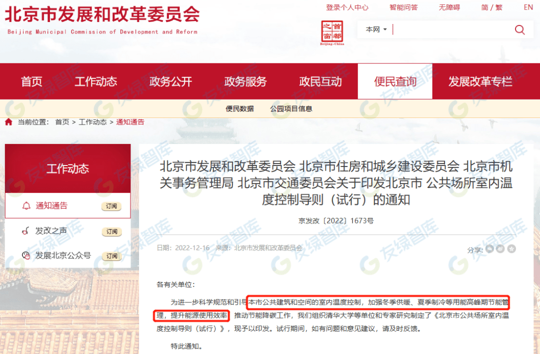 12月16日,北京接连发布了两份文件:北京市发展和改革委员会 北京市住房和城乡建设委员会 北京市机关事务管理局 北京市交通委员会关于印发北京市 公共场所室内温度控制导则(试行)的通知;北京市发展和改革委员会等11部门关于印发北京市进一步强化节能实施方案(2023年版)的通知。