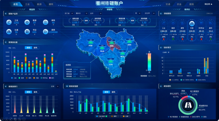 为了满足城市碳账户要做到“足迹清晰、数字精准、核算科学、评价客观”的需求,以及可以系统形成的政府治碳“一站通”、企业减碳“一网清”、个人低碳“一键惠”系列多跨场景,方融科技依托在绿色能源科技领域的先进经验,深度参与建设了覆盖工业、农业、能源、建筑、交通运输、个人六大领域的城市碳账户管理平台。该平台通过对区域内政府、企业和个人的碳数据、碳指标及能耗数据指标实施统一管理,实现了区域内能耗和碳排的全面采集、精准分析、实时展示和智能预警,从而打通政府双碳发展治理端、社会各类能源消费端和各类节能减碳服务业,助力三方协同构建城市双碳智治体系的落实。