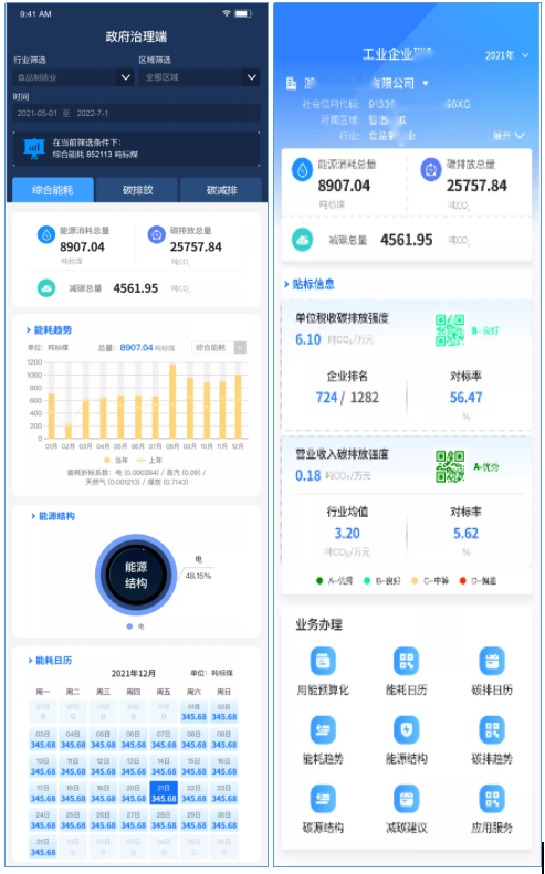 移动端具备对数据及分析结果的快捷友好的查询操作功能,可以同时满足治理端与服务端的业务需求,可通过碳账户移动端直接访问。