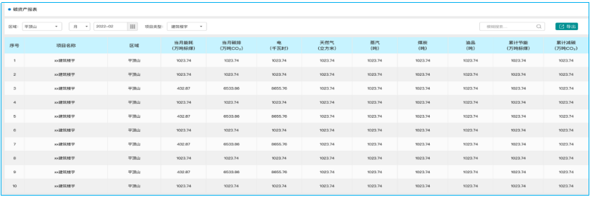 统计园区全范围内各行业企业的能源使用、碳排放情况,清洁能源发电情况、减排情况及贴标结果,支持导出报表信息。